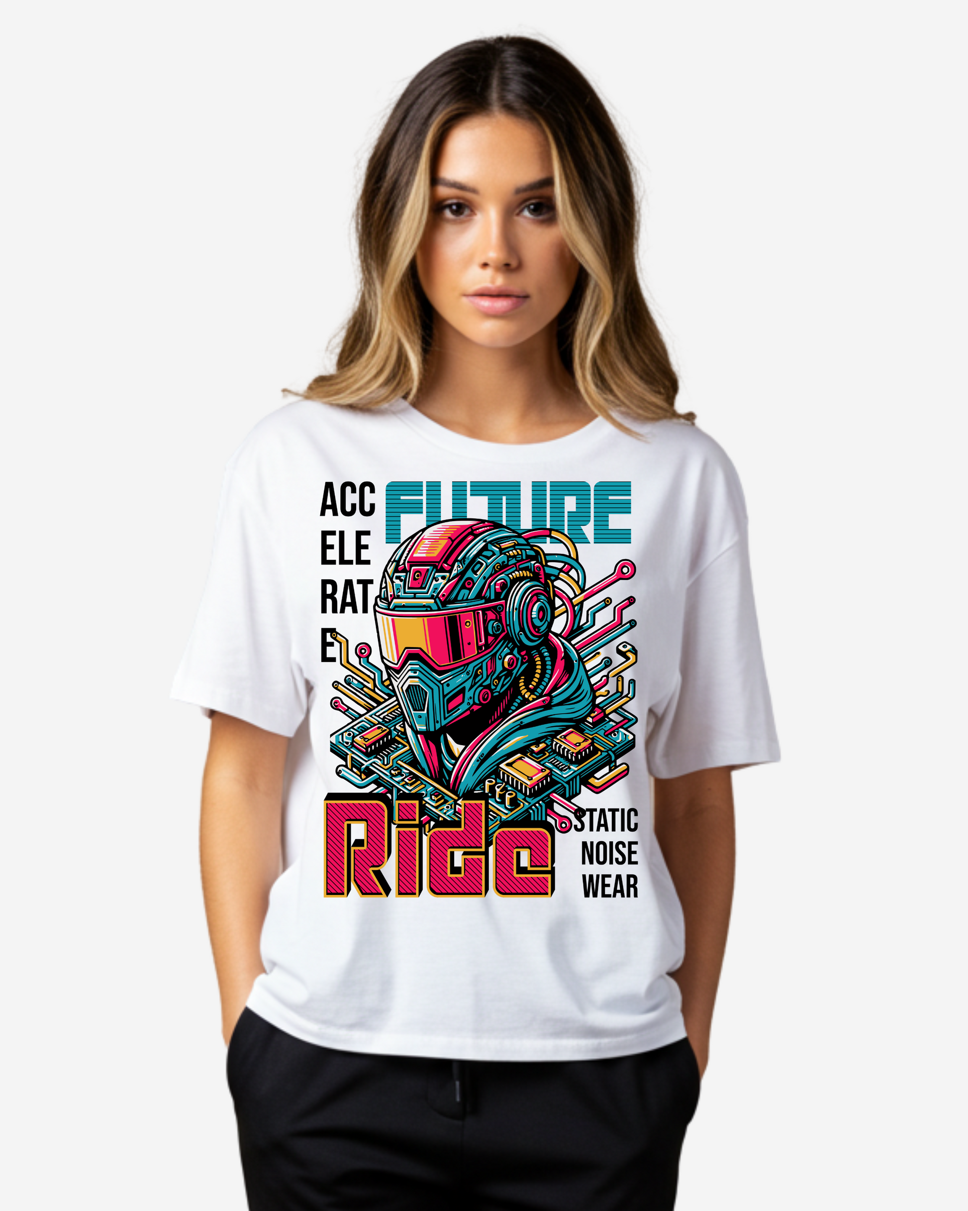Fuel your style with the Accelerate Future Women's Oversized T-Shirt—a bold fusion of techwear attitude and forward-facing fashion. Featuring a dynamic, glitch-inspired graphic that symbolizes motion, progress, and digital disruption, this tee is built for women moving at the speed of innovation.