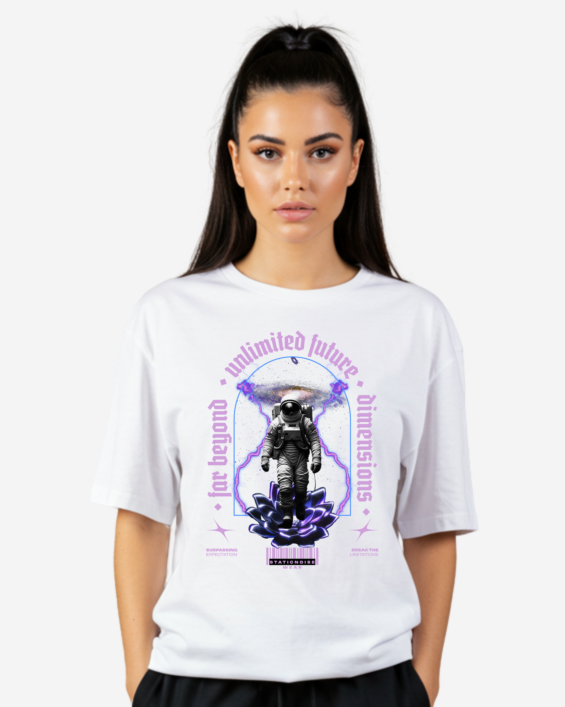 The Astronaut Graphic Women's Oversized T-Shirt is your ticket to space-inspired streetwear. Designed for those who think beyond the limits, this bold tee features a stunning astronaut print surrounded by cosmic elements, stars, and motion graphics that scream movement and mystery. It’s not just fashion—it’s a mission.