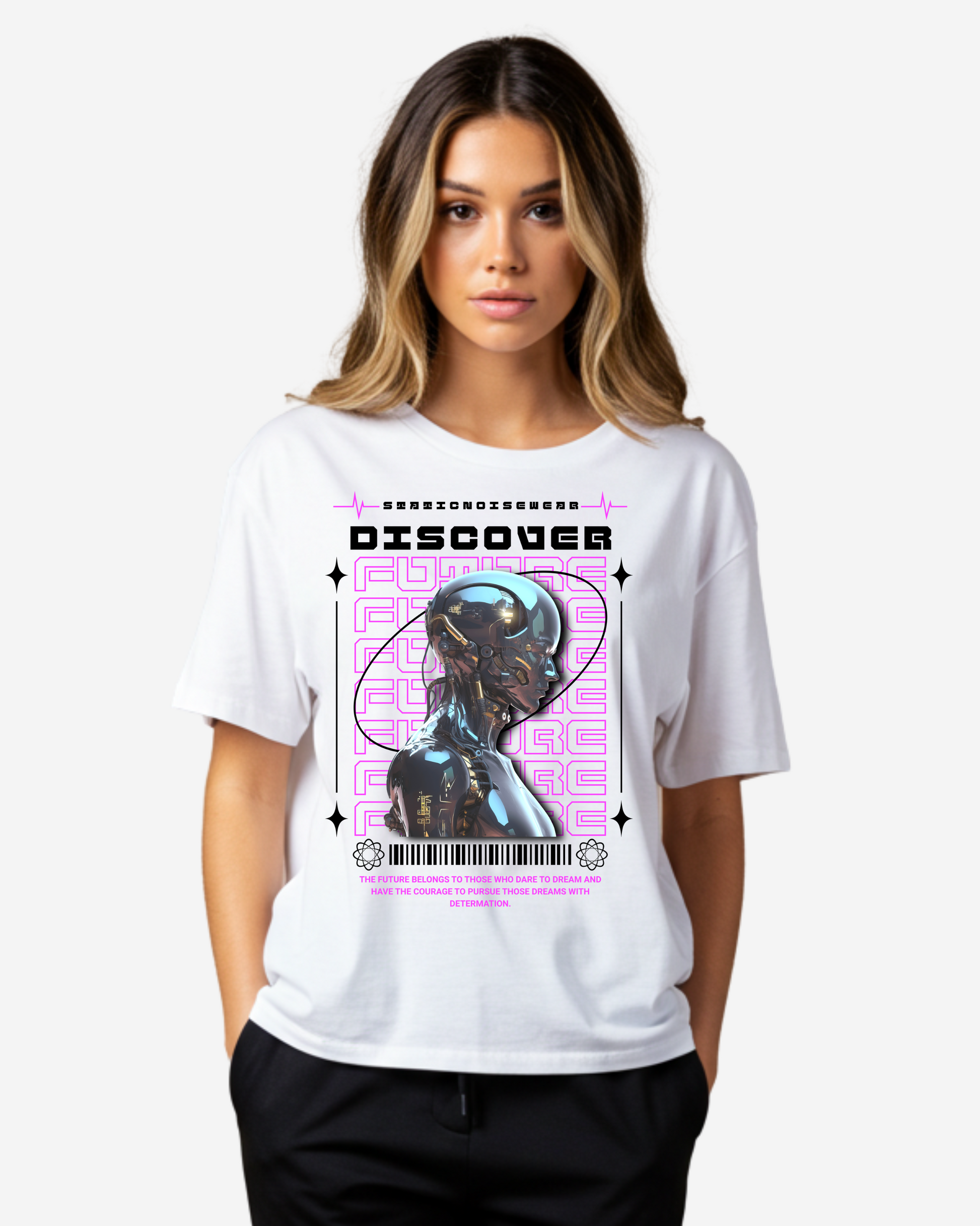 Step into the unknown with the Discover Future Women's Oversized T-Shirt—a bold statement piece for women who embrace innovation, individuality, and forward-thinking fashion. Featuring a minimalist yet impactful graphic inspired by exploration, digital evolution, and space-age aesthetics, this tee is designed for those charting their own course.