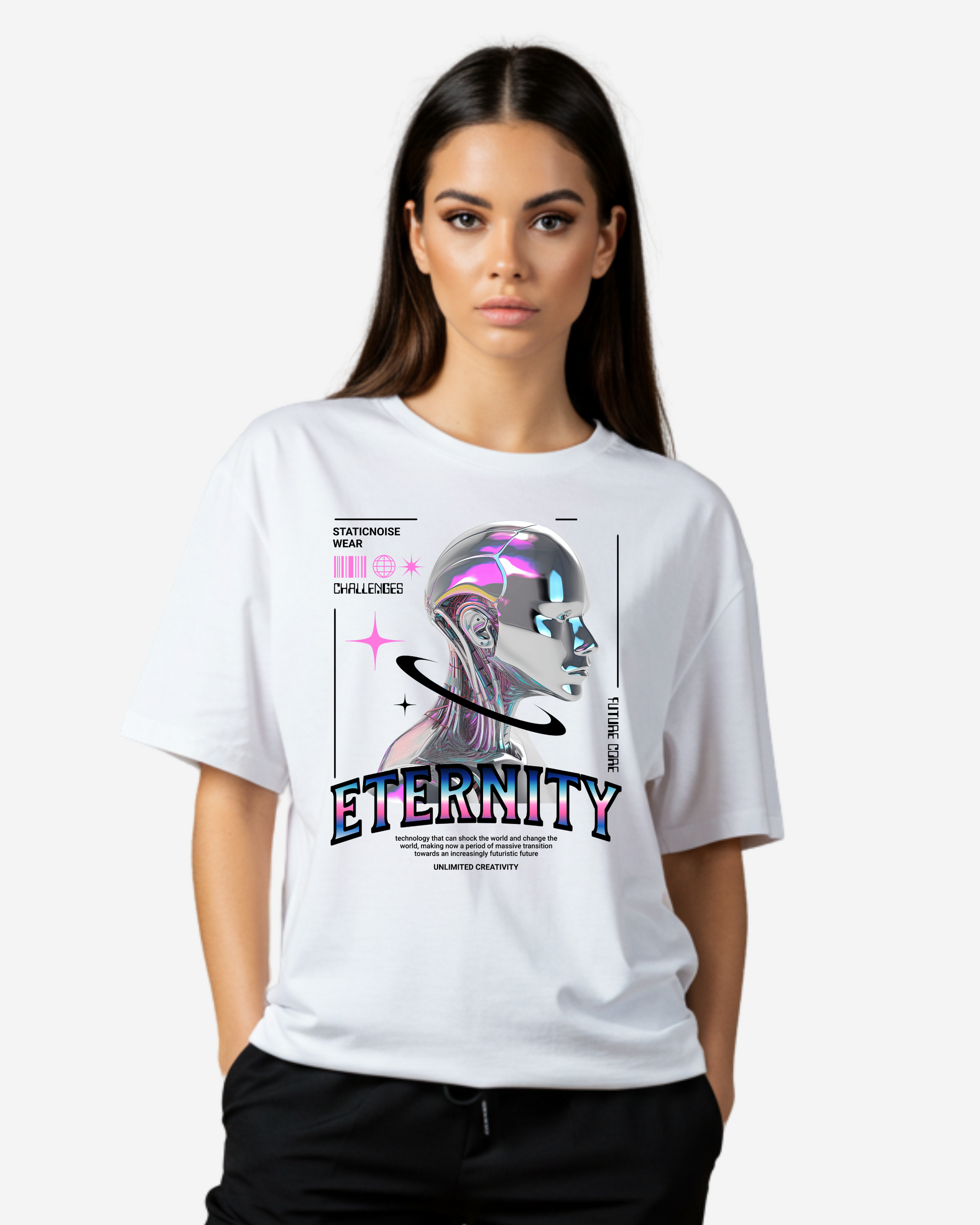 Step into the future with a nod to the past. The Eternity Chrome Y2K Women's Oversized T-Shirt fuses early 2000s cyber nostalgia with bold streetwear attitude. Featuring a high-shine chrome “Eternity” graphic that pops with metallic edge, this tee delivers serious Y2K vibes—think digital rebellion, low-rise attitude, and futuristic flair.