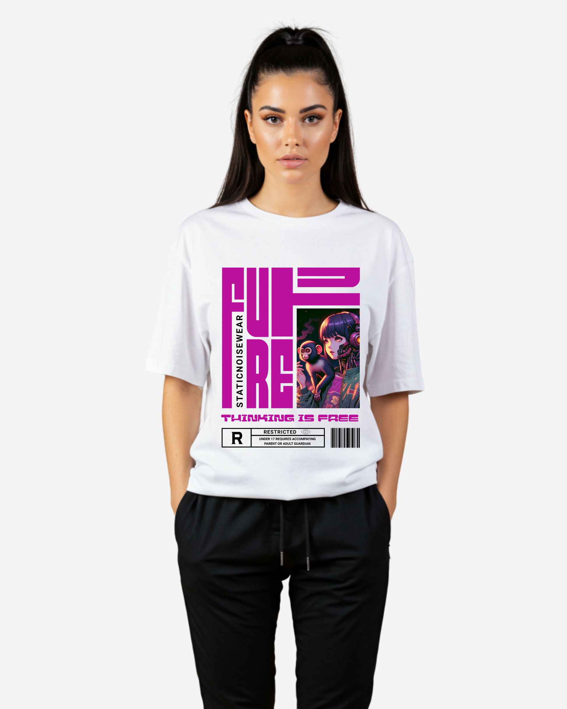 With "FUTURE" sliced in brutalist typography and a raw “R-Rated” aesthetic, it’s a streetwear statement that fuses art, tech, and thought. Made from 100% heavyweight cotton with a relaxed oversized fit, it’s built for thinkers, rebels, and anyone rewriting the code.